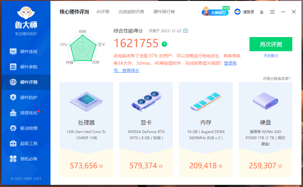 雖說大家都說魯大師是娛樂大師。但是我看測評大佬也一點(diǎn)沒少炫跑分,下面咱們跑一下。整機(jī)1621755分還是相當(dāng)給力的,其中顯卡的比分就占據(jù)了579374分。由此也能看出來這塊技嘉RTX 3070 VISION OC雪鷹的性能還是相當(dāng)優(yōu)秀的。
