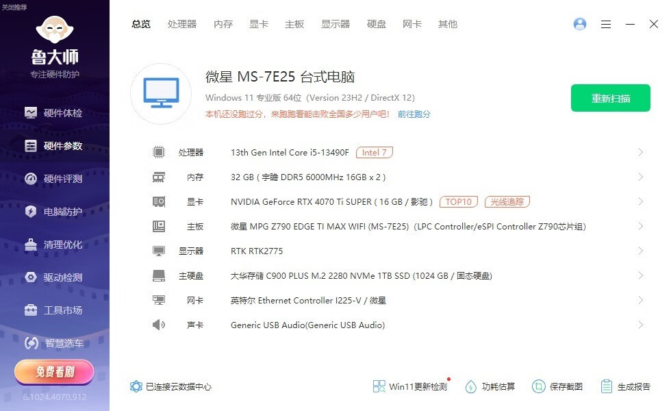 ▼整機配置一覽,處理器是13490F,主板是微星的MPG Z790 EDGE TI MAX WIFI刀鋒鈦主板,顯卡是影馳的RTX4070 Ti Super特殊定制版,整機配置很不錯。