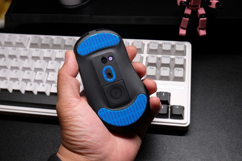 鼠標底部貼附了超大腳墊(藍色是保護膜,用的時候要揭掉噢),真的如絲般順滑,雷柏還為重度用戶提供了備用腳墊,貼心!