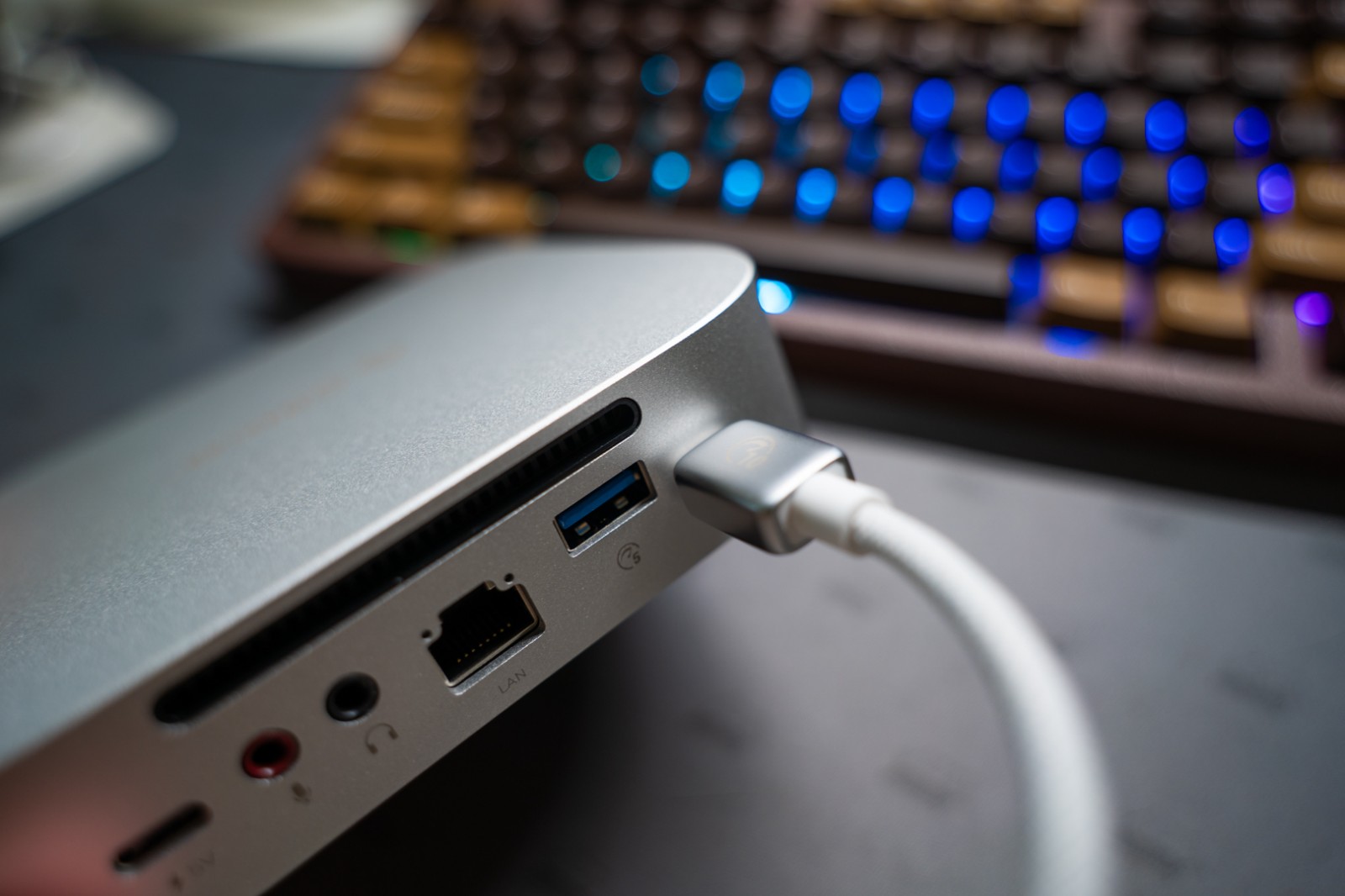 拓展塢背面最上面一排散熱孔,良好的散熱是沒跑了。打頭的第一個口子是個能供5V電的Type-C,需要說明的是這個拓展塢并不需要使用適配器供電,它是直接從MAC Mini上取電的哦!這C口可以臨時給耳機倉、小風扇啥的續個命,賊方便!緊挨著它,專門給麥克風和耳機分了家,各占一個坑,中間杵著個亮閃閃的2.5G網口。接著是一個USB-A口子,仔細看它底下這次標了個小小的“5”, 意思就是“老伙計,我跑5Gbps哈,別拿我跟旁邊那倆快馬比!” 最右邊的Type-C才是大佬,底下那個醒目的“10”標得明明白白,這才是正兒八經接電腦的主通道,10Gbps的猛勁兒就靠它了!